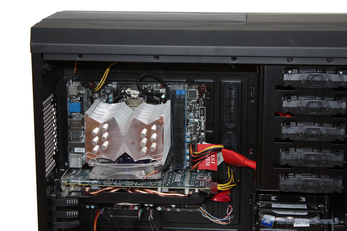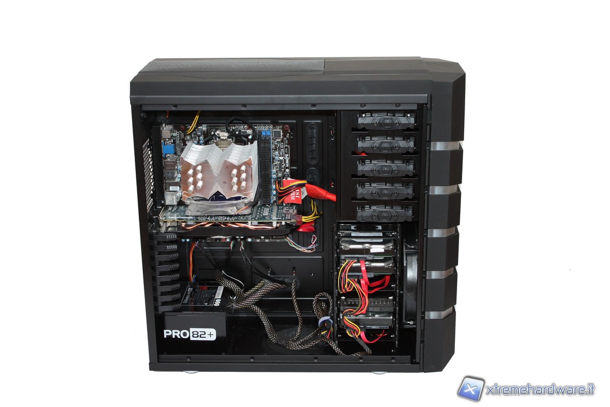 Come potete vedere dalle seguenti immagini abbiamo ottenuto una disposizione ottimale dei cavi di alimentazione anche installando 4 HD e una 5870, lo spazio che ci “avanza” internamente per poter lavorare è davvero tanto.