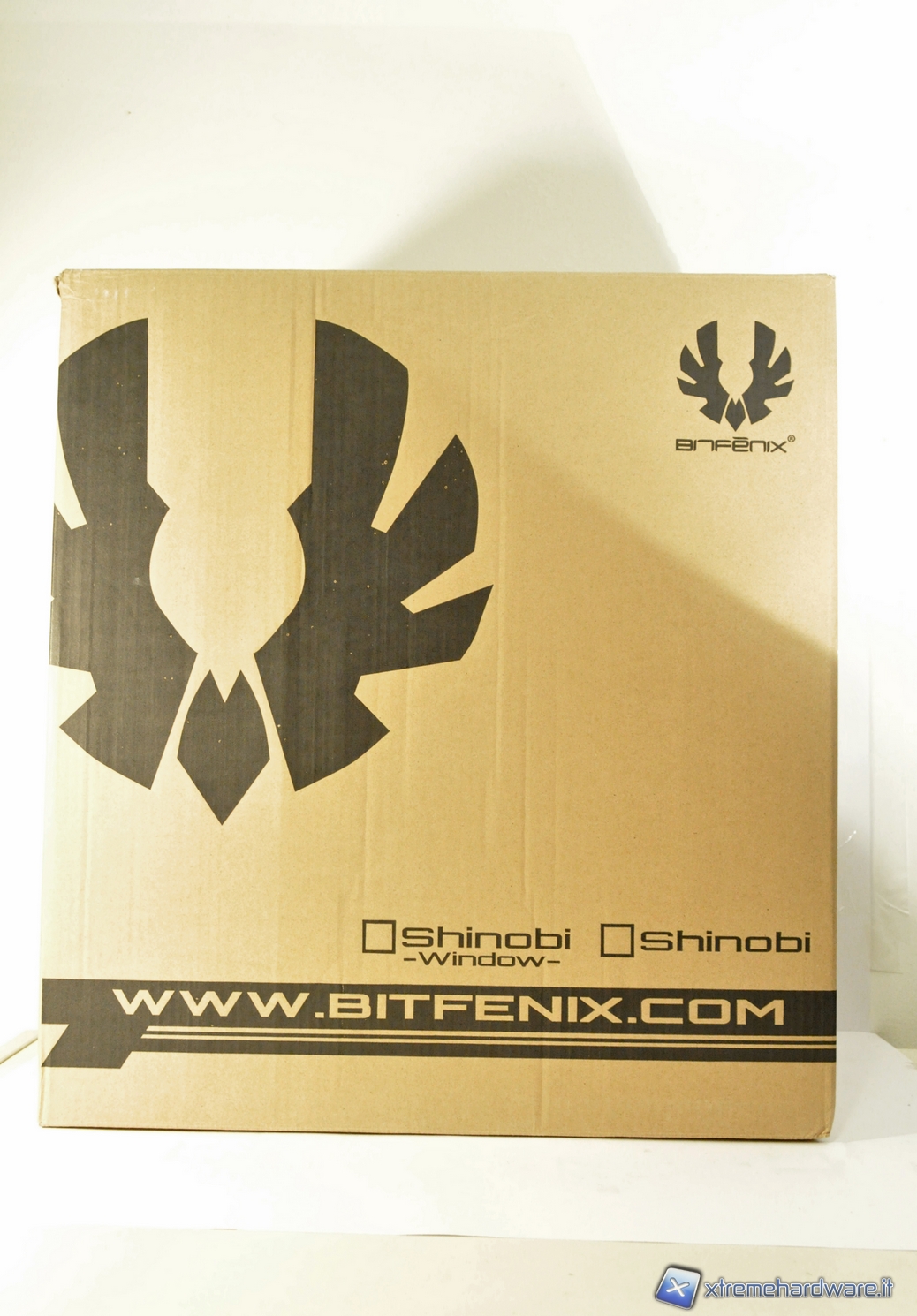Il Bitfenix Shinobi giunto in redazione è contenuto in una confezione di cartone di colore giallo. Aprendo la scatola, notiamo che il case è protetto da due strati di polistirolo e racchiuso in un telo di plastica al fine di evitare graffi e danneggiamenti durante il trasporto.